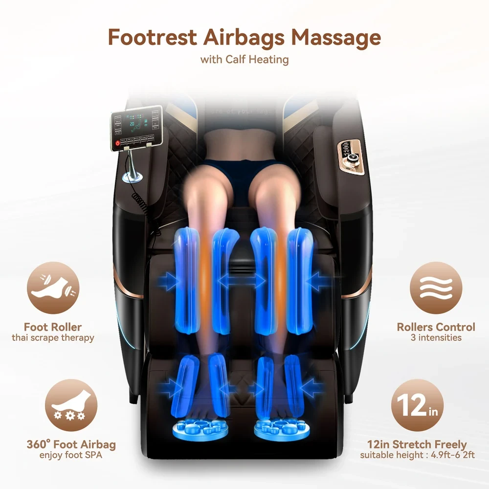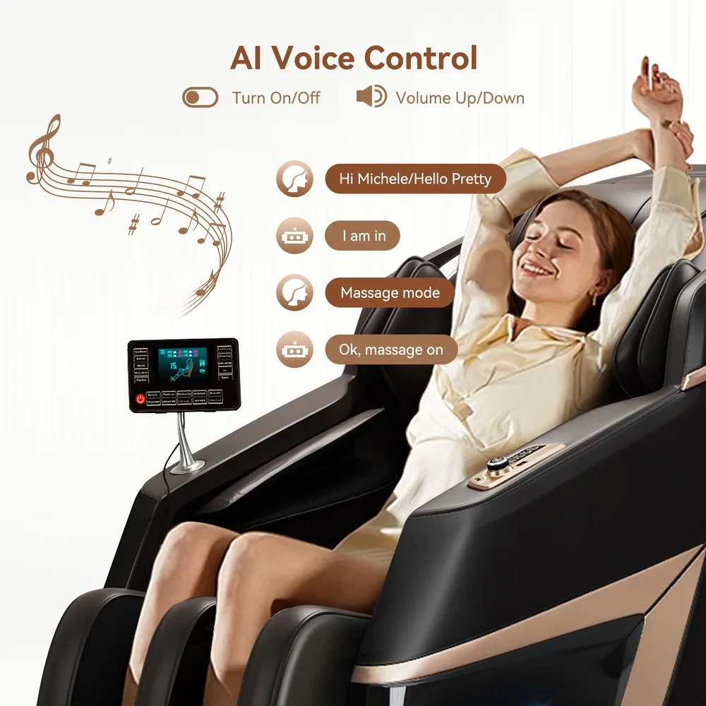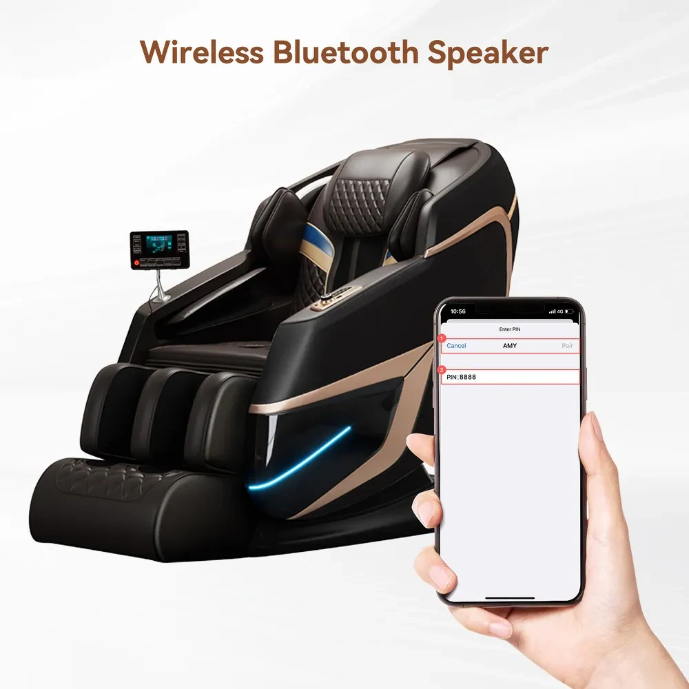 This all-inclusive zero gravity massage chair can bring you the perfect massage experience at home. Eye-catching appearance and advanced design will make your home decor with high-technique exterior look. With 5 massage programs, you can adjust the speed, width and intensity at will, to make it much more convenient to meet your different kinds of massage needs.There is a clear screen, also with a bluetooth function and voice control, you can easily to operate the chair. The airbags on different spaces can fully help you relieve body fatigue and pain. Moreover, the chair has a wheel on the bottom, you can easily move it to anywhere. Humanized design, amazing look premium quality material,and advantageous price, make our chair is a wonderful choice for you!
