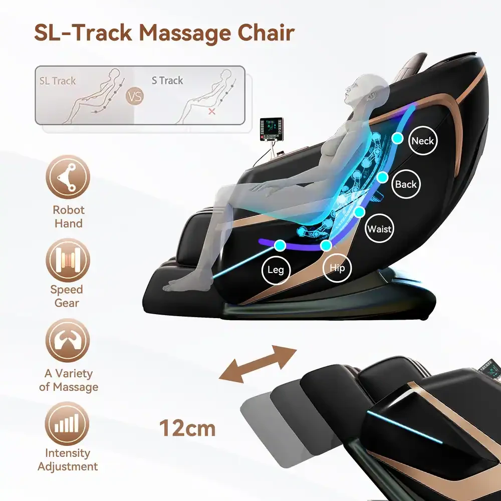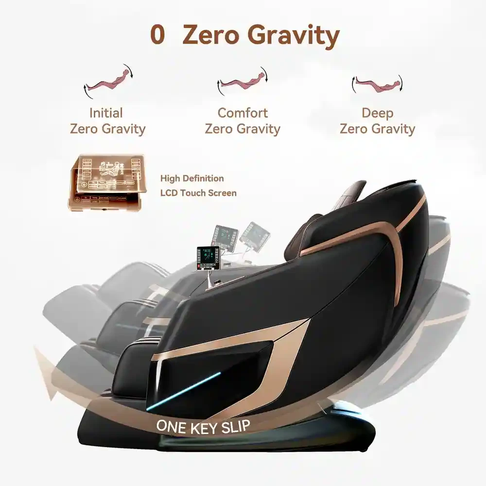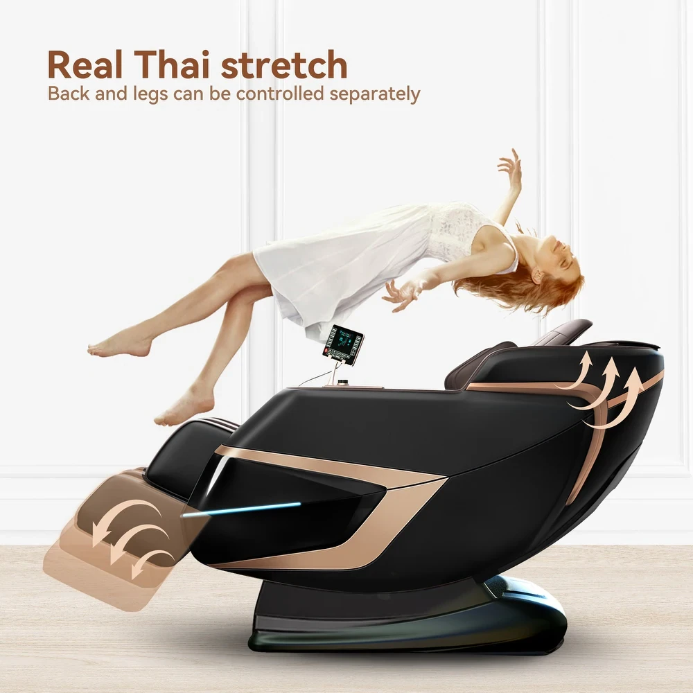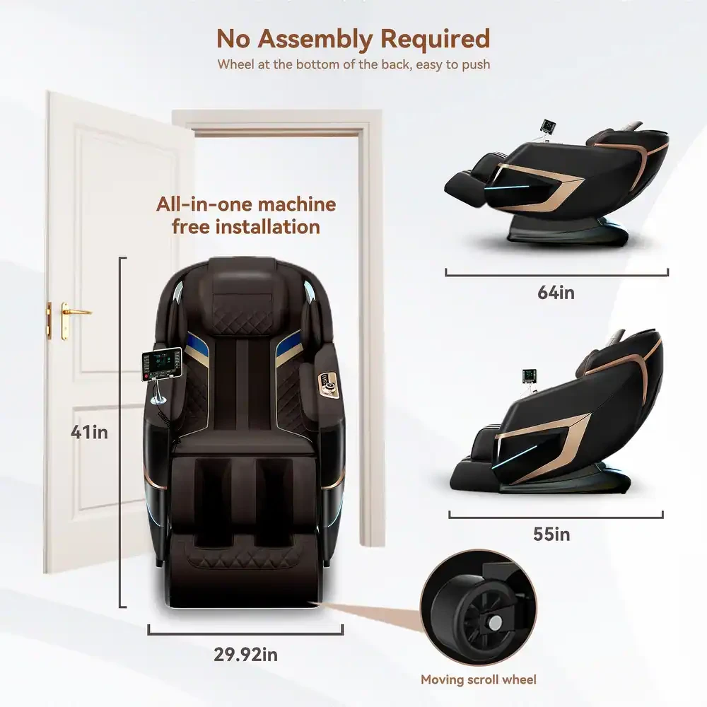 This all-inclusive zero gravity massage chair can bring you the perfect massage experience at home. Eye-catching appearance and advanced design will make your home decor with high-technique exterior look. With 5 massage programs, you can adjust the speed, width and intensity at will, to make it much more convenient to meet your different kinds of massage needs.There is a clear screen, also with a bluetooth function and voice control, you can easily to operate the chair. The airbags on different spaces can fully help you relieve body fatigue and pain. Moreover, the chair has a wheel on the bottom, you can easily move it to anywhere. Humanized design, amazing look premium quality material,and advantageous price, make our chair is a wonderful choice for you!